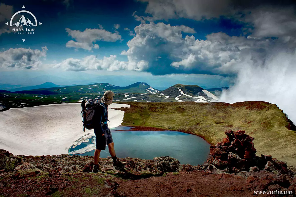 Geghama Mountains are a range of mountains in Armenia. The range is a tableland-type watershed basin of Sevan Lake from east, inflows of rivers Araks and Hrazdan from north and west, Azat and Vedi rivers from south-west and Arpachai river from south. The average elevation of the Gegham mountain range is near 2500m. The range is of volcanic origin including many extinct volcanoes. The range is 70 km length and 48 km width, and stretch between Lake Sevan and the Ararat plain. The highest peak of the Gegham mountains is the Azhdahak, at 3597m. They are formed by a volcanic field, containing Pleistocene-to-Holocene lava domes and cinder cones.The highland reaches a height of 1800–2000m up to 3000m in the dividing ridge.